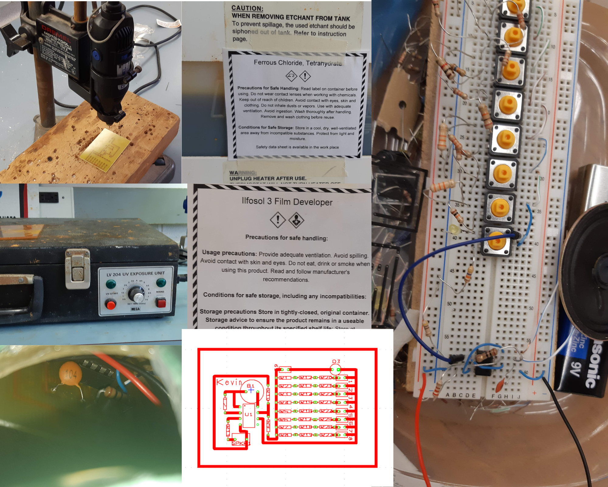 A schematic is designed on CircuitMaker which is then tested on a breadboard. A PCB layout is designed based on the schematic created and printed onto a piece of acetate and imprinted onto a copper clad board using a UV exposure unit. PCB is then put through Ilfosol 3 film developer and the circuit is then etched onto the board using Ferric Chloride.